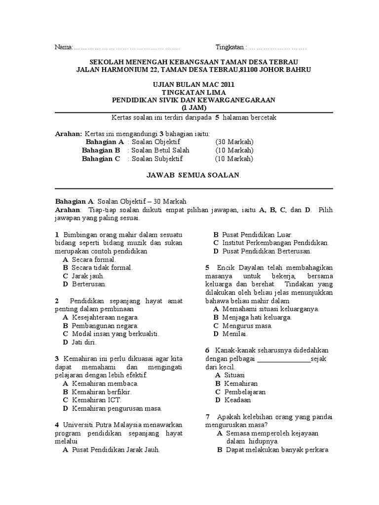 Soalan Peperiksaan Awal Tahun Ujian Mac 2018 Kssm Tingkatan 5 Pendidikan Sivik Dan Kewarganegaraan Cikgu Ayu